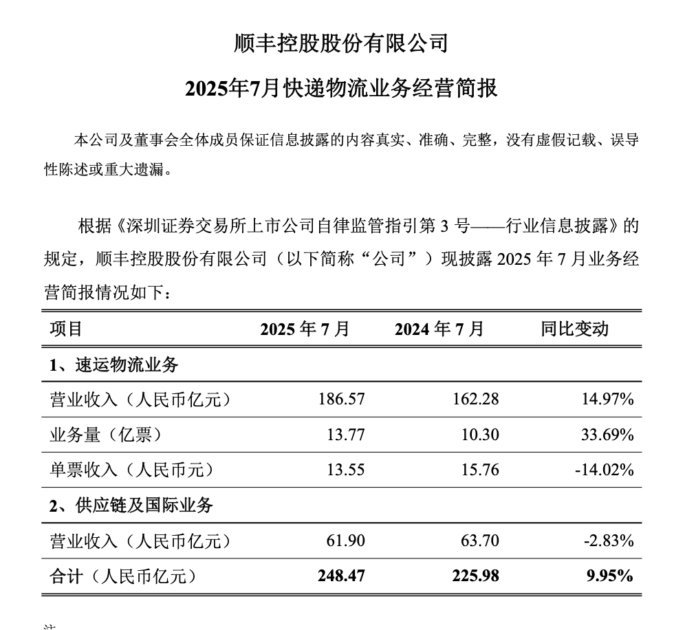 但目前看,這一效應(yīng)似乎還未傳遞到順豐身上。根據(jù)官方數(shù)據(jù),今年7月,順豐實現(xiàn)營收186.57億元,同比增長14.97%;業(yè)務(wù)量13.77億票,同比增長33.69%。但這期間,順豐單票收入依然下滑,單票收入為13.55元,同比下跌14.02%。