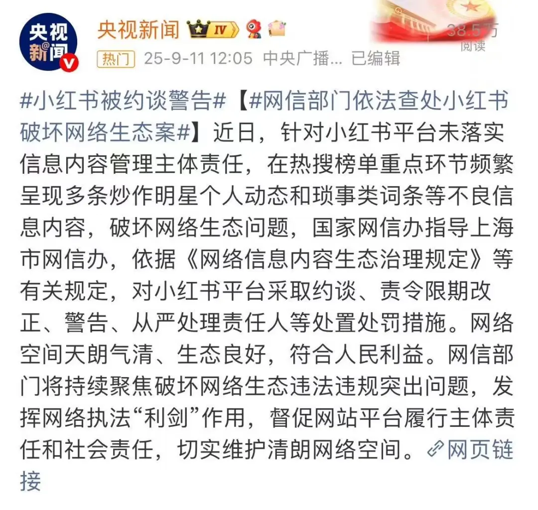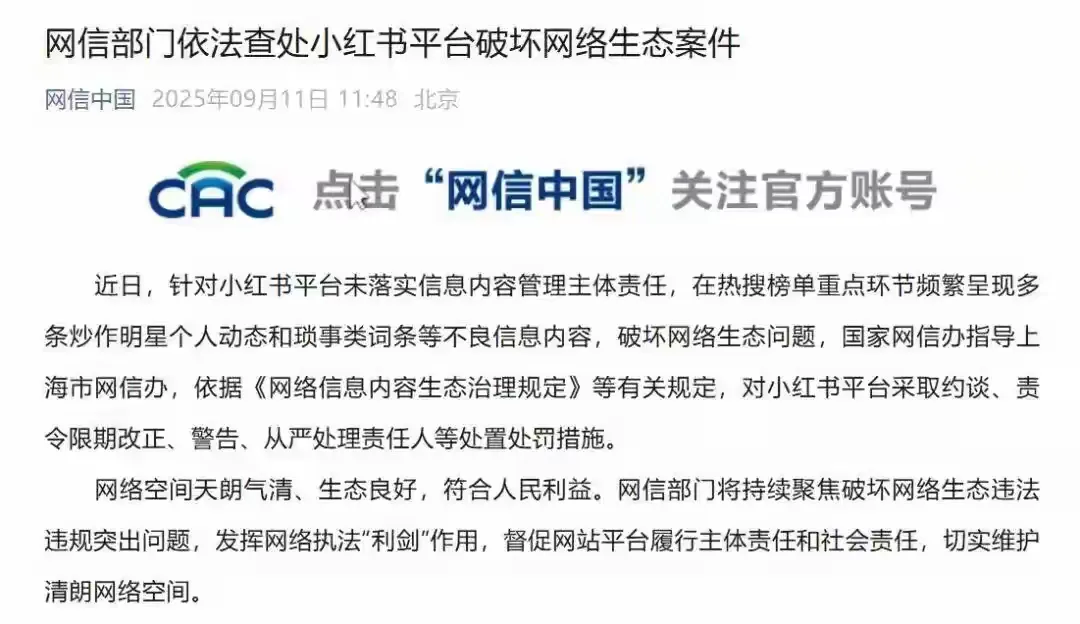 國家網(wǎng)信辦發(fā)布通報,針對小紅書在熱搜榜單重點環(huán)節(jié)“頻繁呈現(xiàn)多條炒作明星個人動態(tài)和瑣事類詞條等不良信息內(nèi)容”的違規(guī)行為,依法開展查處工作。