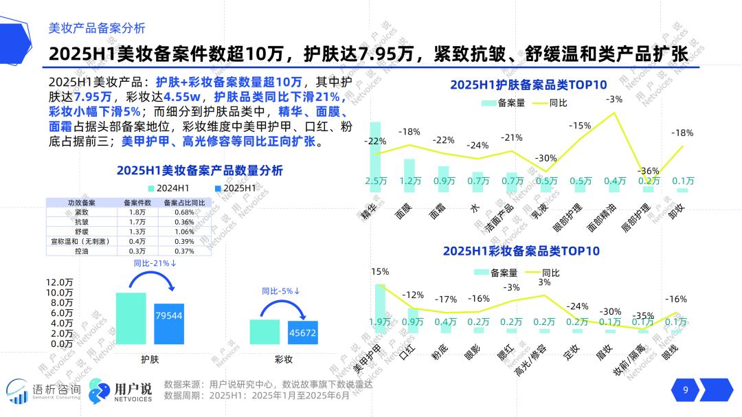 用戶說數(shù)據(jù)顯示,2025年上半年,護膚+彩妝備案數(shù)量超10萬,其中護膚達7.95萬,彩妝達4.55w,護膚品類同比下滑21%,彩妝小幅下滑5%。由此可見,當(dāng)護膚市場逐漸趨于飽和時,彩妝市場反而具有更大的發(fā)展?jié)摿Α?/p>