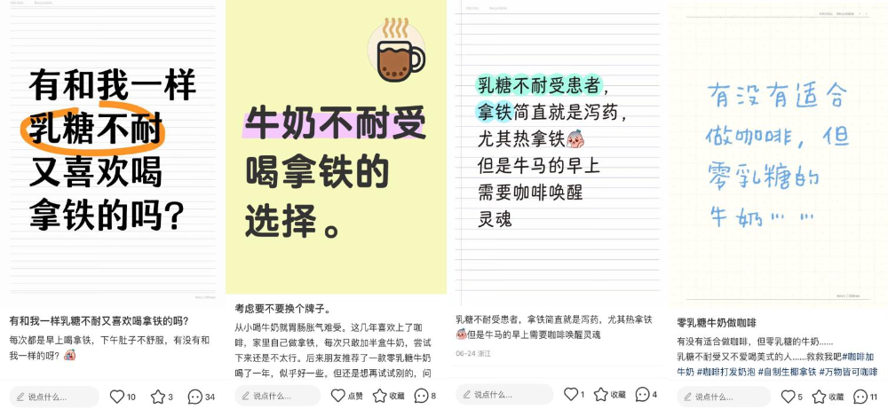 根據(jù)國(guó)金證券數(shù)據(jù),目前消費(fèi)者主要攝入的現(xiàn)磨咖啡品類(lèi)中拿鐵位居第一,占59%。與此同時(shí)小紅書(shū)上"無(wú)乳糖拿鐵"相關(guān)話題瀏覽量超1.2萬(wàn),許多網(wǎng)友都在尋求更好的0乳糖選擇。