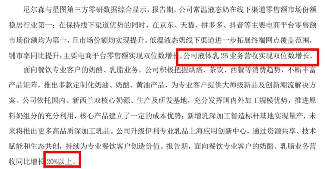 伊利2025年半年報(bào)數(shù)據(jù)顯示,伊利B端業(yè)務(wù)營(yíng)收占比增長(zhǎng)20%以上。