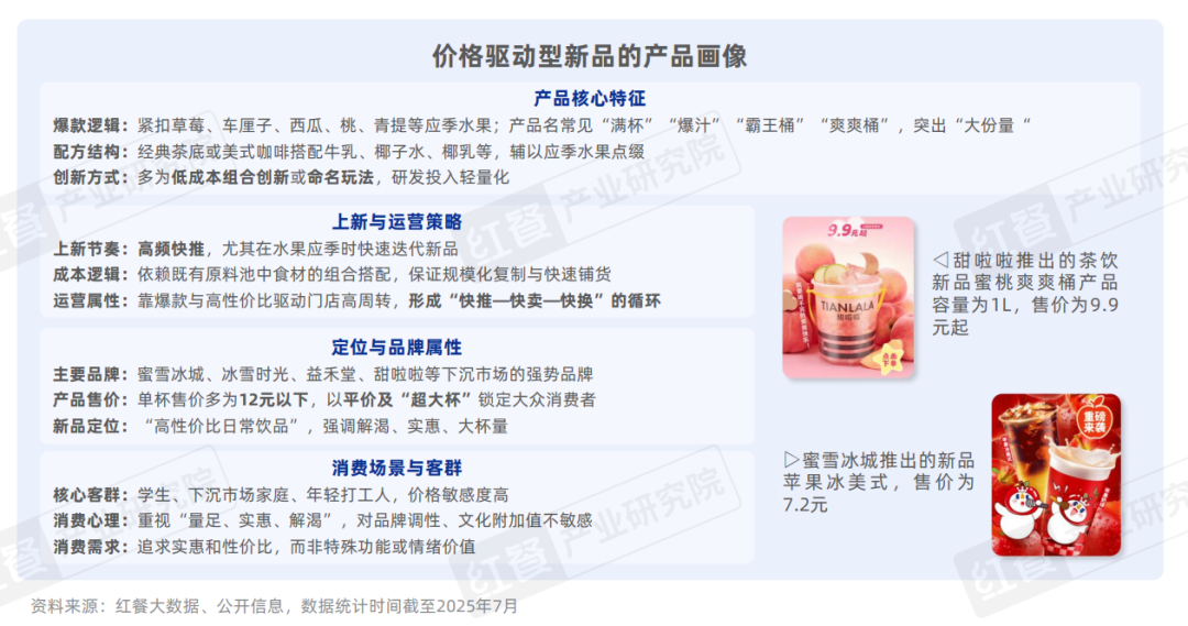 價格驅動型新品的核心特征是以低價、大杯量為基礎,通過應季水果與經(jīng)典茶基底、咖啡基底的快速組合,制造爆款與應季新品,滿足高頻、解渴、性價比消費場景。