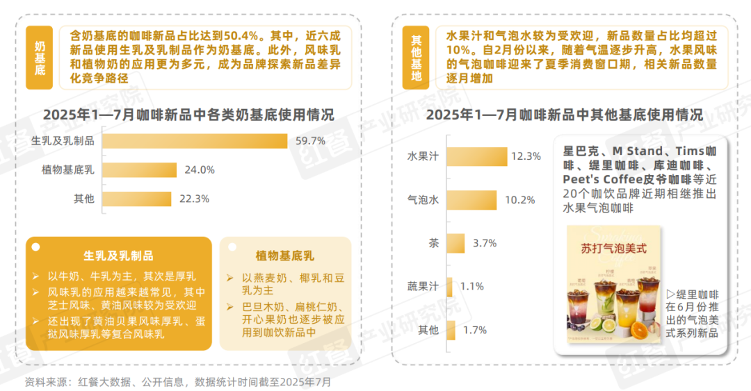 在咖啡新品的奶基底應用中,生乳及乳制品仍為核心,但品牌已將其從單一口感承載轉向多元風味創(chuàng)新,通過芝士、黃油等風味乳強化產(chǎn)品個性和產(chǎn)品溢價延展。此外,植物奶的滲透持續(xù)上升,既契合健康與可持續(xù)消費趨勢,也為新品提供了更多的風味組合。