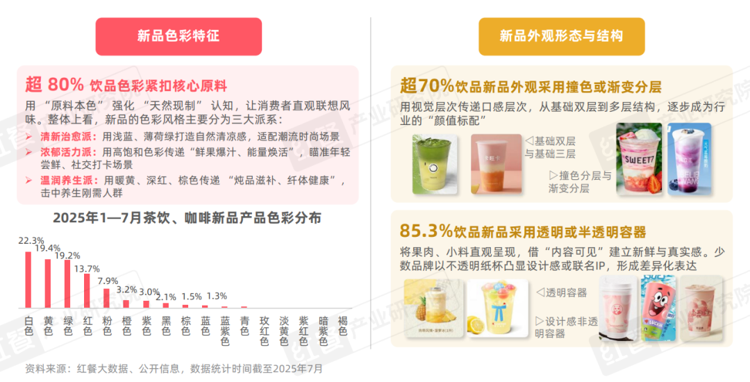 2025年1—7月的茶飲、咖啡新品外觀特征已從“單純好看”進化到“顏值+價值+傳播”三位一體,新品外觀既建立品質(zhì)信任,又承載情緒共鳴與社交傳播,成為品牌競爭的重要維度。