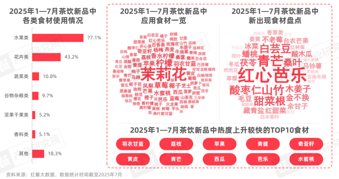 在食材應用方面,水果作為茶飲基礎且廣受歡迎的原料,始終是品牌創(chuàng)新的核心切入點之一,2025年1—7月,使用了水果類食材的茶飲新品占比高達 77.1%;ɑ茴愂巢臑椴栾嫀愍毺氐幕ㄏ泔L味與視覺呈現(xiàn),相關新品占比達到43.2%,其中茉莉花成為茶飲花香風味的重要來源。而蔬菜類、谷物雜糧類、堅果干果類、香料類食材占比相對較低,在茶飲中的應用仍有較大拓展空間。