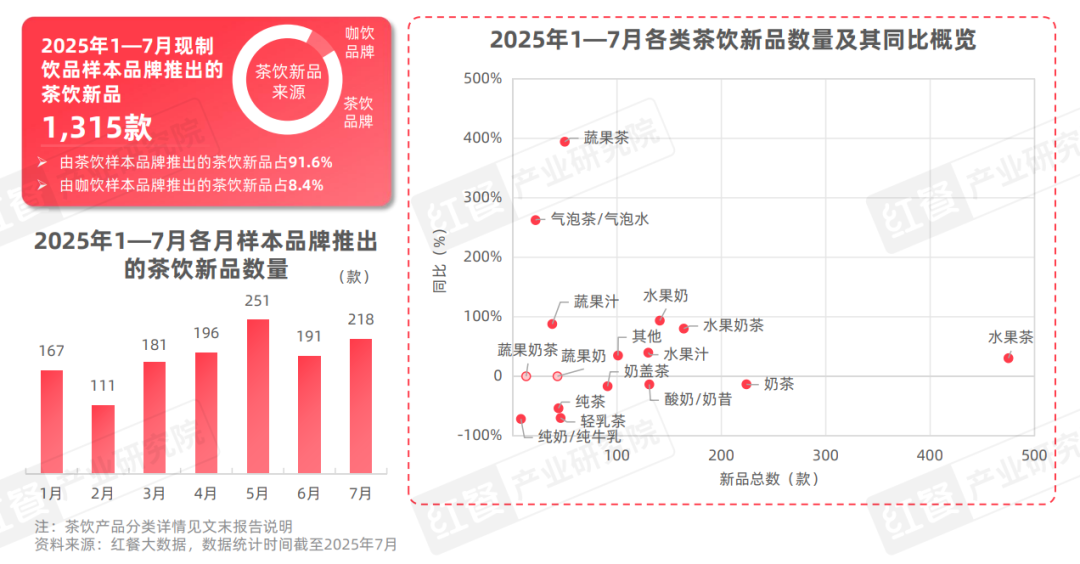 紅餐產(chǎn)業(yè)研究院2025年1—7月錄得現(xiàn)制飲品樣本品牌共推出1,315款茶飲新品,其中91.6%的茶飲新品來自茶飲樣本品牌,而咖飲樣本品牌亦貢獻了8.4%。
