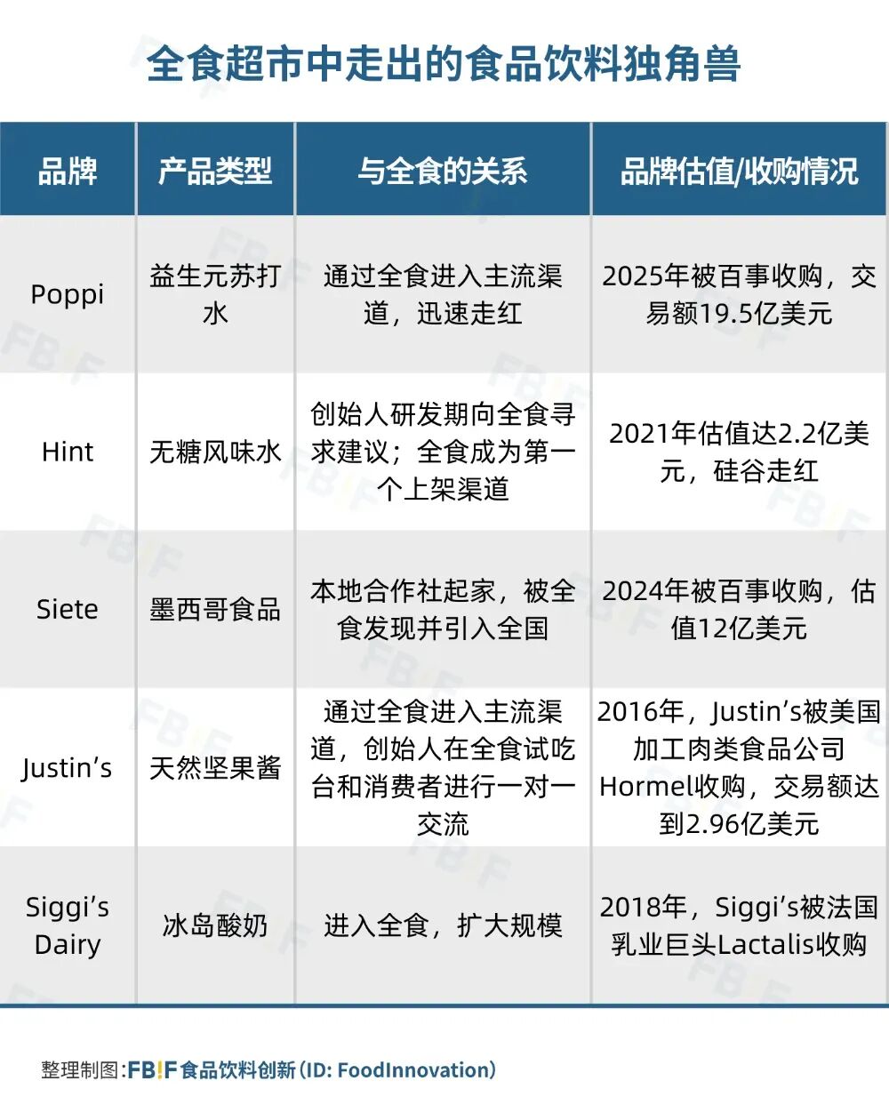 據(jù)FBIF不完全統(tǒng)計,從Poppi到Hint,再從Justin’s到Siggi’s Dairy,至少有5個獨角獸品牌,它們自初創(chuàng)階段進入全食超市。這些品牌借此走進大眾視野,在獲得高估值后,可能會被食品巨頭收購,開啟全球化的發(fā)展路徑。