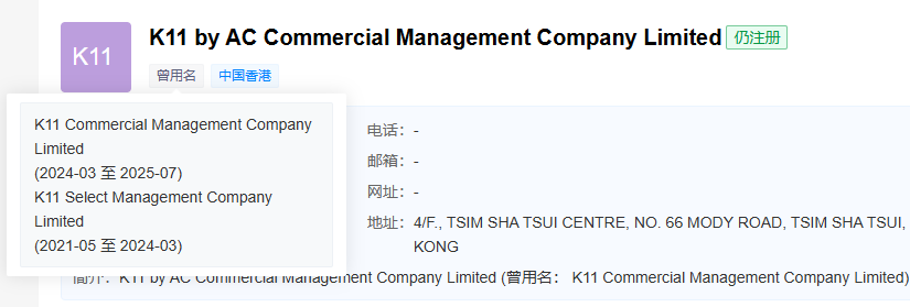 天眼查顯示,K11 by AC集團全稱為K11 by AC Commercial Management Company Limited,原名為K11 Commercial Management Company Limited,于2021年在香港成立。