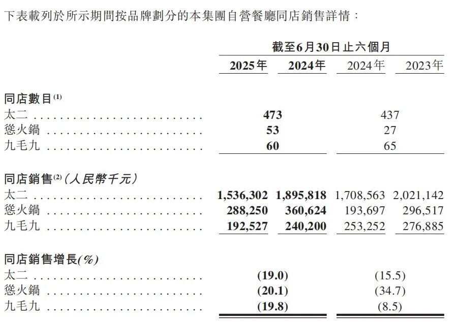 與此同時,其核心經營指標持續(xù)承壓。上半年太二營收為19.49億元,同比下滑13.3%,這一跌幅超過九毛九集團整體水平;同店銷售額也大幅下滑19%。