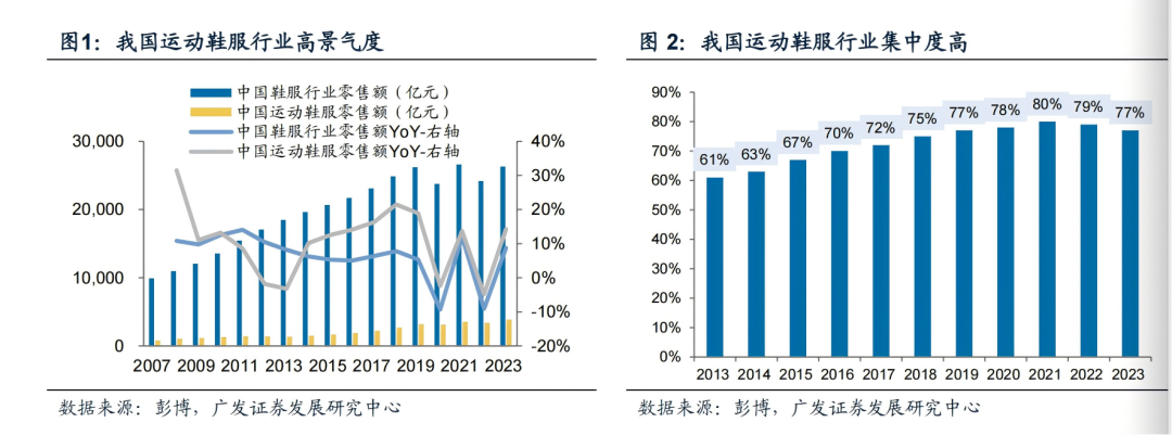 所謂的“逆風(fēng)”,指的是行業(yè)環(huán)境和國產(chǎn)運(yùn)服競爭角色的變化。告別過去十年的中高位數(shù)增長,2024年國內(nèi)運(yùn)動(dòng)鞋服市場同比增長僅5.9%,但行業(yè) CR5 保持在70%上下。