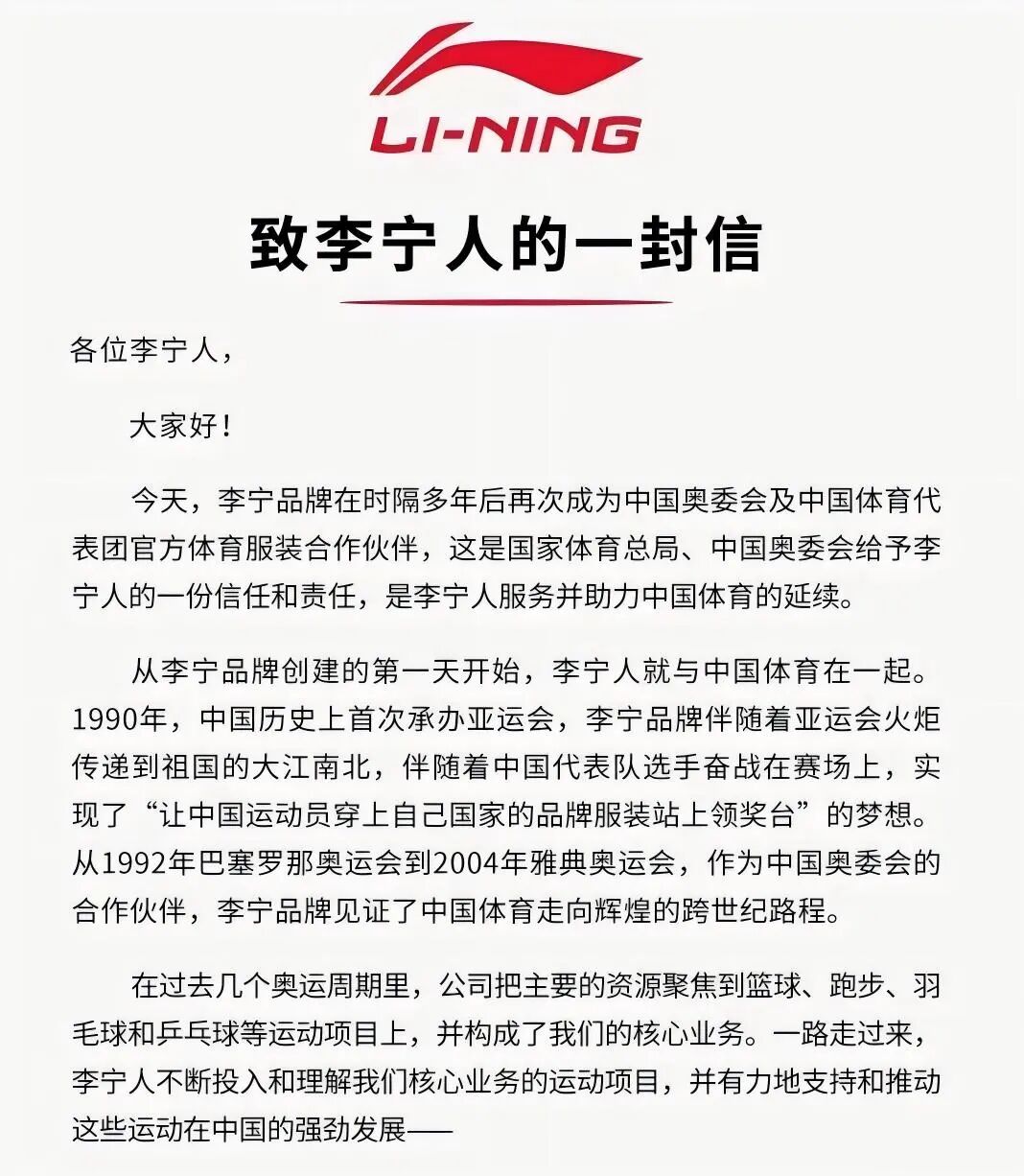 今年1月15日,上海聯(lián)交所正式發(fā)布公告,宣布李寧接替安踏,成為2025-2028年中國奧委會(huì)及中國體育代表團(tuán)官方體育服裝合作伙伴,創(chuàng)始人李寧罕見對內(nèi)發(fā)布《致李寧人的一封信》,信中寫道:“希望每一個(gè)李寧人都能自豪地接受這份榮譽(yù)和使命!
