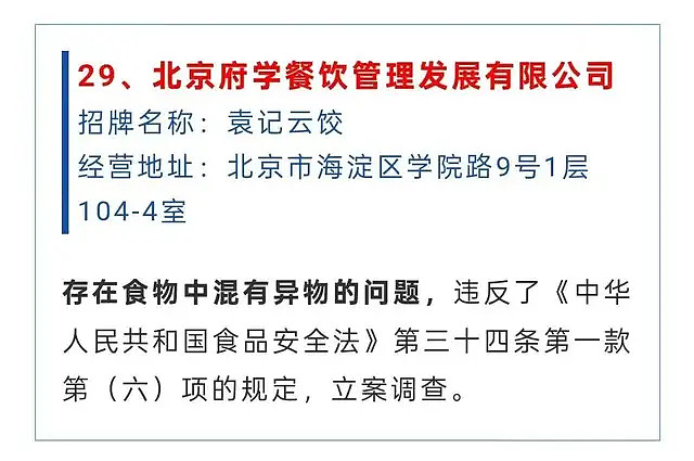 隨后在北京海淀區(qū)市監(jiān)部門公開餐飲食品安全大檢查結(jié)果中,“袁記云餃”北京府學(xué)餐飲管理發(fā)展有限公司因存在食物中混有異物,違法《食品安全法》而被立案調(diào)查。