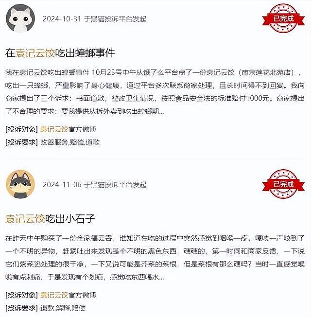 除此之外,袁記云餃的食品安全問題也是愈演愈烈。有人吃出蚯蚓,有人嚼到石子,有人見過螳螂,在黑貓投訴平臺,與袁記云餃相關(guān)的投訴超過600條,“吃出異物”是重災(zāi)區(qū)。