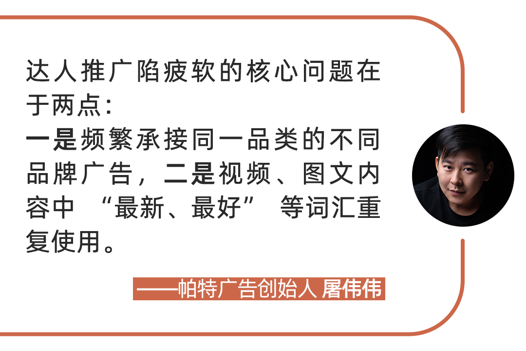 而從實(shí)際情況來(lái)看,屠偉偉表示:“目前,達(dá)人推廣深陷疲軟主因在于頻繁承接類似廣告,以及內(nèi)容中話術(shù)的重復(fù)使用,導(dǎo)致消費(fèi)者難以獲取專業(yè)篩選及實(shí)際測(cè)評(píng)信息。由此,出現(xiàn)達(dá)人口碑下滑、粉絲下單熱度降低的困局。