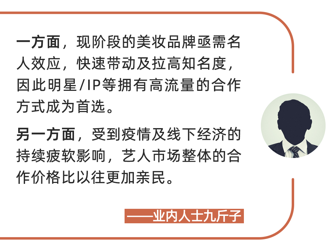 而業(yè)內(nèi)資深人士九斤子(化名)則表示,“品牌方每年的預(yù)算都是先用先得,目前有很多國(guó)貨美妝需要通過(guò)持續(xù)曝光來(lái)維持自身聲量。而它們集體選擇明星營(yíng)銷主要有兩大考量:名人效應(yīng)及藝人合作價(jià)格降低!