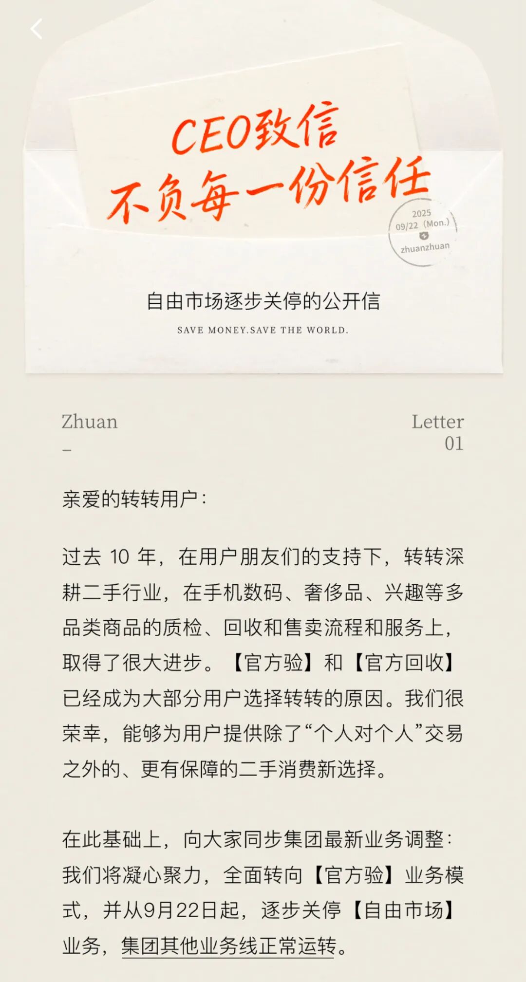 9月22日,轉(zhuǎn)轉(zhuǎn)集團(tuán)官方宣布,將逐漸關(guān)停旗下“自由市場(chǎng)”,即C2C業(yè)務(wù),轉(zhuǎn)而全力聚焦二手“官方驗(yàn)”業(yè)務(wù)模式。這個(gè)曾讓轉(zhuǎn)轉(zhuǎn)起家的業(yè)務(wù),最終以GMV占比不足3%的姿態(tài)謝幕。