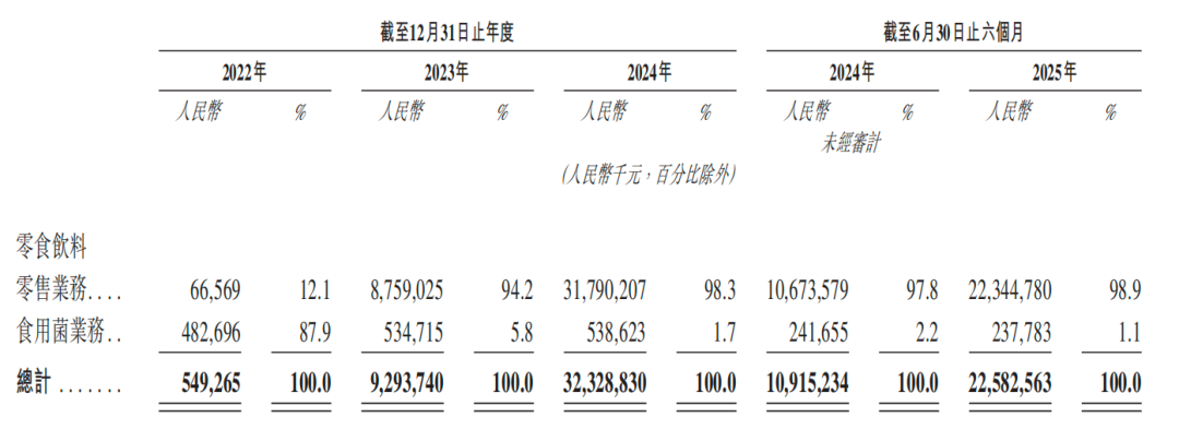 財(cái)務(wù)數(shù)據(jù)顯示,萬辰集團(tuán)從“菇”到“零”轉(zhuǎn)型后其營收規(guī)?焖贁U(kuò)張:2024年?duì)I收323.29億元,較2023年的92.94億元同比增長247.9%;2025年上半年?duì)I收225.83億元,同比增長106.89%,其中量販零食業(yè)務(wù)占比達(dá)98.9%,已成絕對核心。