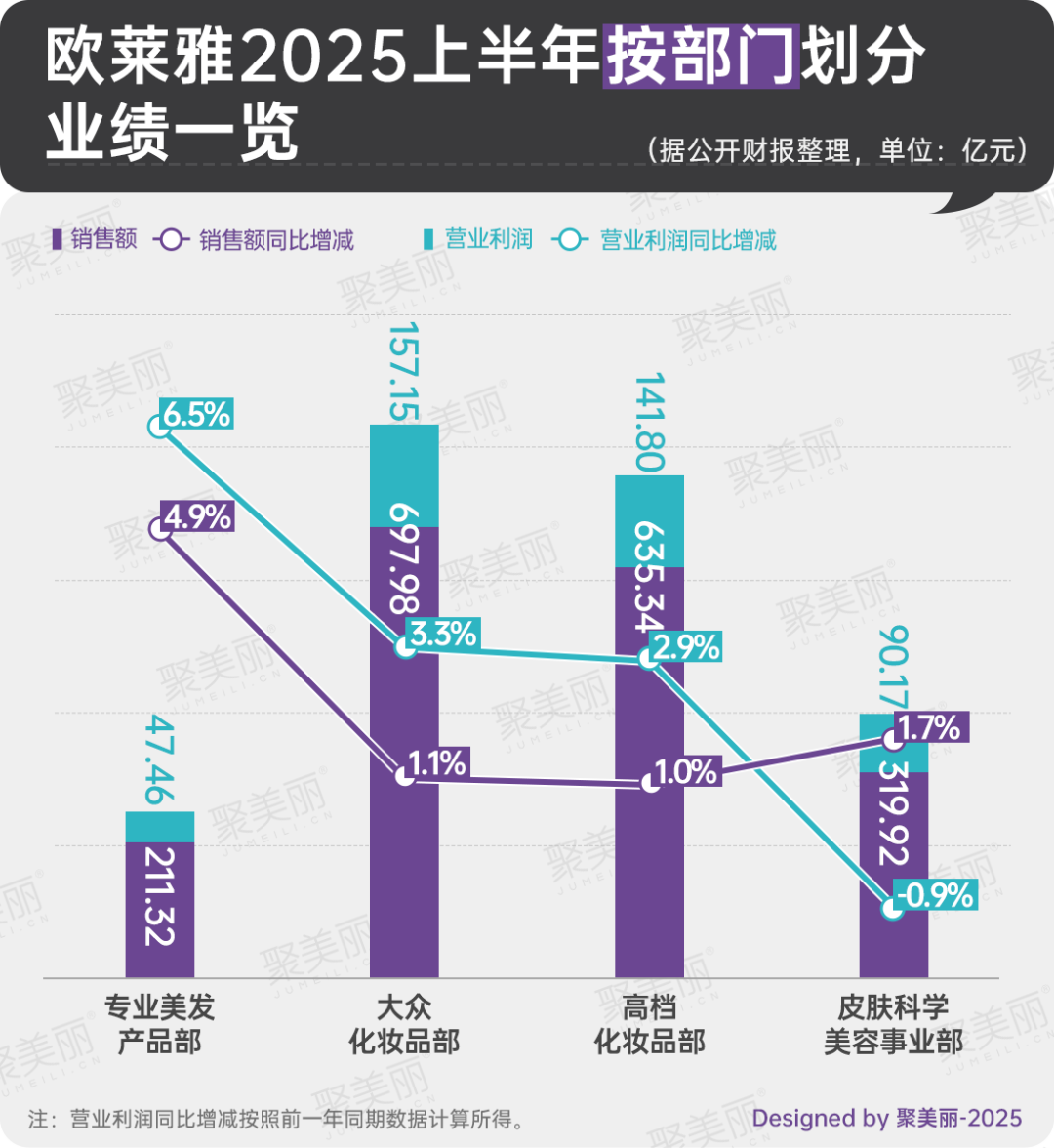 不僅如此,在2025上半年中,歐萊雅皮膚科學(xué)美容事業(yè)部出現(xiàn)利潤下滑,專業(yè)美發(fā)部、大眾化妝品部及高檔化妝品部銷售額及營業(yè)利潤的增速,也均不如此前。