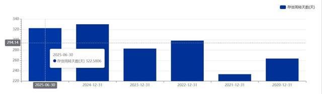 2025年上半年,公司存貨余額進一步上攀至102.55億元,較上年同期(24H1)的95.53億元進一步增長了近7個百分點,并且同期存貨周轉(zhuǎn)天數(shù)達到323天,庫存的高企意味著對公司流動資金的占用已到了不容忽視的地步。