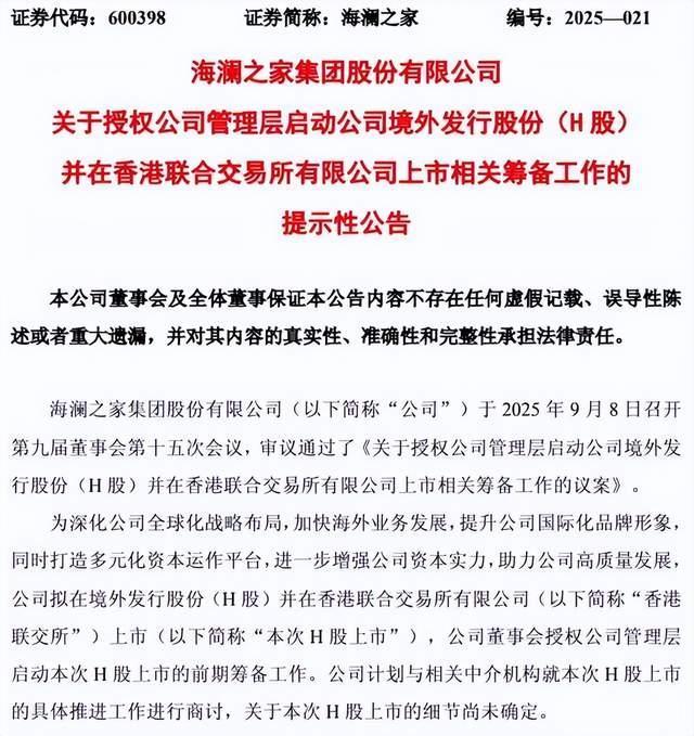 9月8日,海瀾之家發(fā)布公告稱,擬在境外發(fā)行股份(H股)并在香港聯(lián)交所上市,董事會已審議通過議案并授權(quán)公司管理層啟動相關(guān)前期籌備工作,此舉旨在深化全球化戰(zhàn)略布局,加快海外業(yè)務發(fā)展。