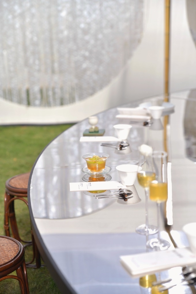 「吃席」-“海月”源于江南園林中“以材映意、虛實相生”的造園智慧。取海月貝為材,將月之意向融入復廊、靜水與茶亭之中,構(gòu)建一處雖不見月、但處處映月的詩意景域。在“海月茶亭”中特設圓桌席,依古禮、奉茶酒,呈現(xiàn)融匯器、茶、酒文化的東方美席。午后清茶、入夜酌酒,既是對園林觀游美學的當代轉(zhuǎn)譯,亦是一場中西融合的生活美學實踐。