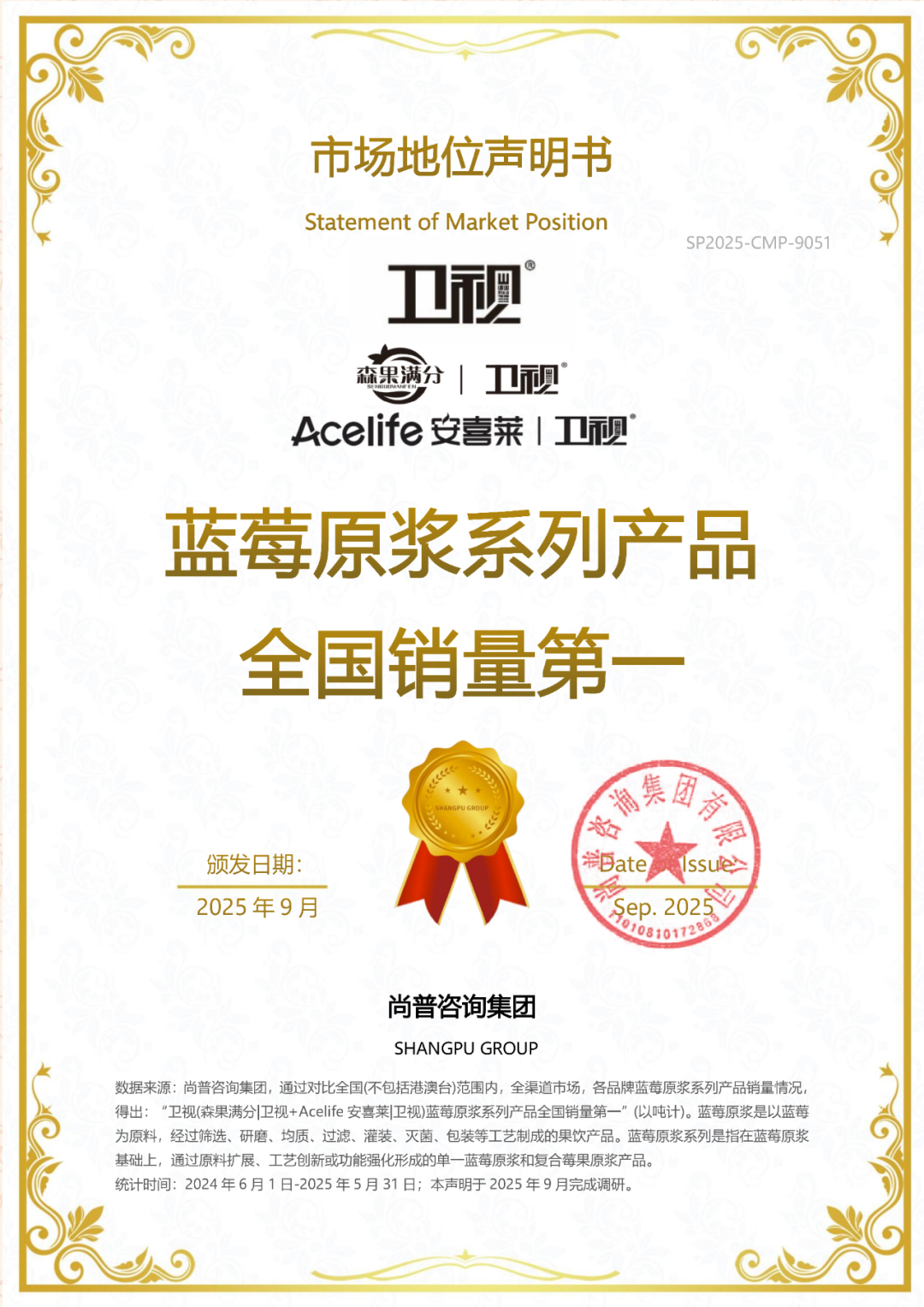 一年后的九月,森果滿分|衛(wèi)視拿下尚普咨詢集團(tuán)出具的“藍(lán)莓原漿系列產(chǎn)品全國銷量第一”的認(rèn)證。