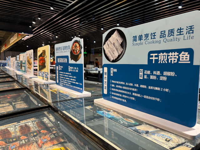 在顧客服務方面,門店的服務細節(jié)亦盡顯匠心。水產品現(xiàn)撈瀝水,包裝袋除皮;設有防凍、防扎手套,連卷袋濕手器;收銀臺為顧客提供一次性用品(筷子、勺子、叉子、吸管等)。店內還有商品介紹、挑選技巧、烹飪菜單等一系列的主題卡片和溫馨提示,為顧客提供極大便利。