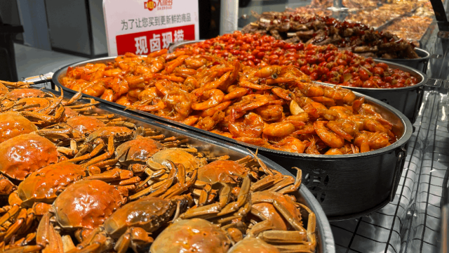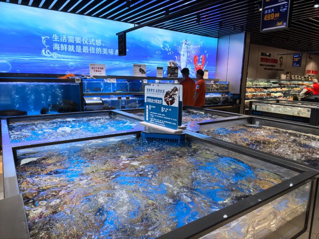 在水產區(qū),商品組合非常豐富,更加注重品質。這里有599元/只的澳龍、499元/只的波龍、299元/斤的帝王蟹、188元/斤的波龍、249元/斤的珍寶蟹、149元/斤的面包蟹等品質之選,也有鱖魚、鱸魚、多寶魚、生蠔、基圍蝦等極致性價比之選。