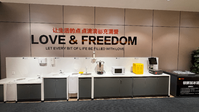 與此同時,門店專門設置了便民服務區(qū)和顧客休息區(qū),洗手臺、紙巾、烘手器、護手霜、直飲水、一次性紙杯、微波爐、公平秤、加冰站等便民設施一應俱全,并隨季供應免費茶水。
