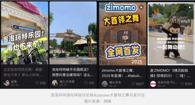 但線下樂園的開設(shè),對于增強粉絲粘性、社媒出圈仍有一定助力。比如Zimomo大首領(lǐng)之舞在Labubu走紅之后,在社媒平臺得到進一步廣泛傳播,為品牌帶來一定聲量熱度。