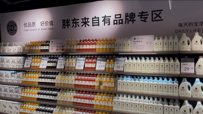 商品方面,門店商品均為一線品牌和品質(zhì)可靠的二線品牌,同時(shí)優(yōu)選當(dāng)?shù)靥厣唐、全球進(jìn)口優(yōu)質(zhì)商品以及趨勢(shì)類網(wǎng)紅商品,極大豐富了商品品類,滿足不同消費(fèi)群體的需求。比如牛羊肉、奶制品、干果、馕餅、椒麻雞等。門店上架了多款胖東來(lái)自有品牌爆款商品,生鮮面積占比超過(guò)50%。
