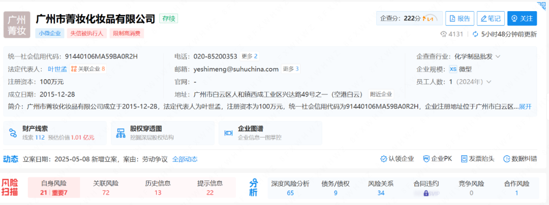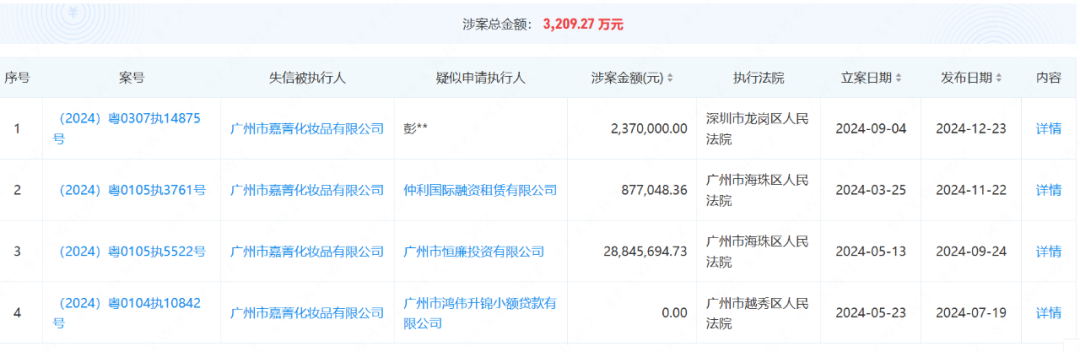 廣州菁妝則成立于2015年,法人代表為葉世孟(葉漢坤之子,尚惠集團(tuán)二代接班人),目前該公司雖然尚未進(jìn)入破產(chǎn)清算程序,但作為尚惠集團(tuán)關(guān)聯(lián)企業(yè),也存在明顯的經(jīng)營(yíng)風(fēng)險(xiǎn)。2023年廣州菁妝被廣州市白云區(qū)人民法院列為失信被執(zhí)行人,涉案總金額為130.51萬元。