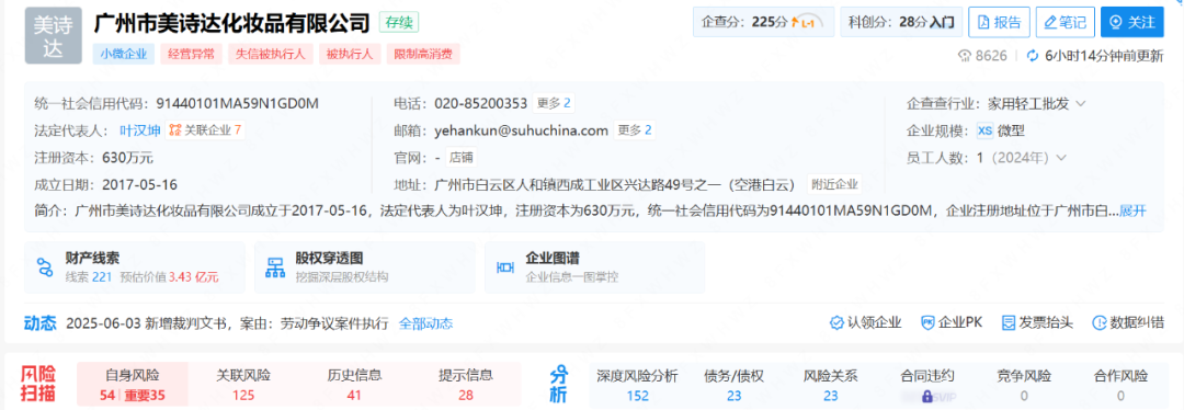 聚焦廣州美詩(shī)達(dá)的發(fā)展境況,據(jù)企查查顯示,其成立于2017年,主營(yíng)化妝品批發(fā)業(yè)務(wù),法人代表為尚惠集團(tuán)創(chuàng)始人葉漢坤。2023年,廣州美詩(shī)達(dá)被廣州市市場(chǎng)監(jiān)督管理局,因登記的住所或者經(jīng)營(yíng)場(chǎng)所無法聯(lián)系為由,列入經(jīng)營(yíng)異常名錄,此后其也開始面臨諸多高額負(fù)債,同時(shí)還涉及多起包括金融借款合同糾紛和勞動(dòng)爭(zhēng)議在內(nèi)的案件。