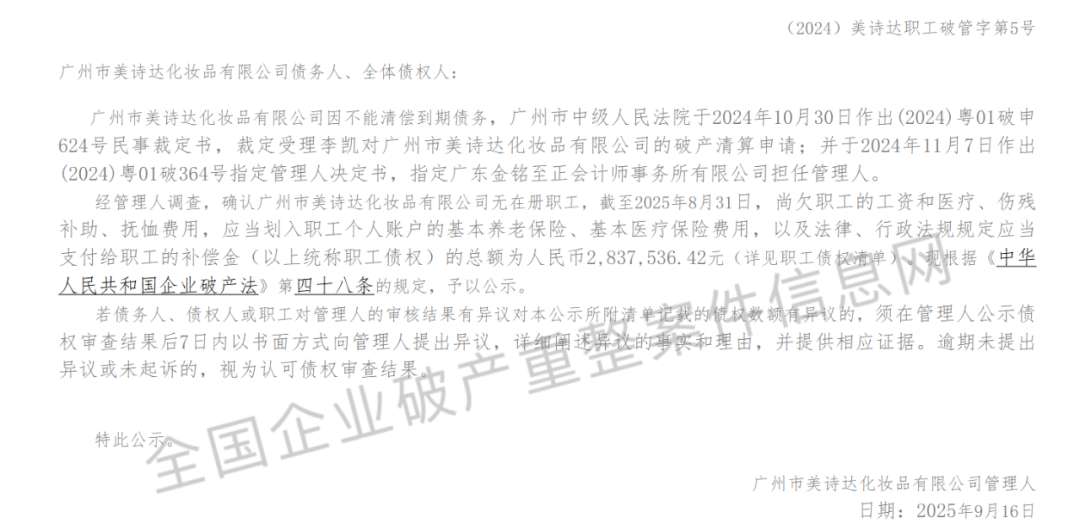 近期,全國(guó)企業(yè)破產(chǎn)重整案件信息網(wǎng)公布了尚惠集團(tuán)旗下另一子公司——廣州市美詩(shī)達(dá)化妝品有限公司(以下簡(jiǎn)稱:廣州美詩(shī)達(dá))的職工債權(quán)審查結(jié)果公示。