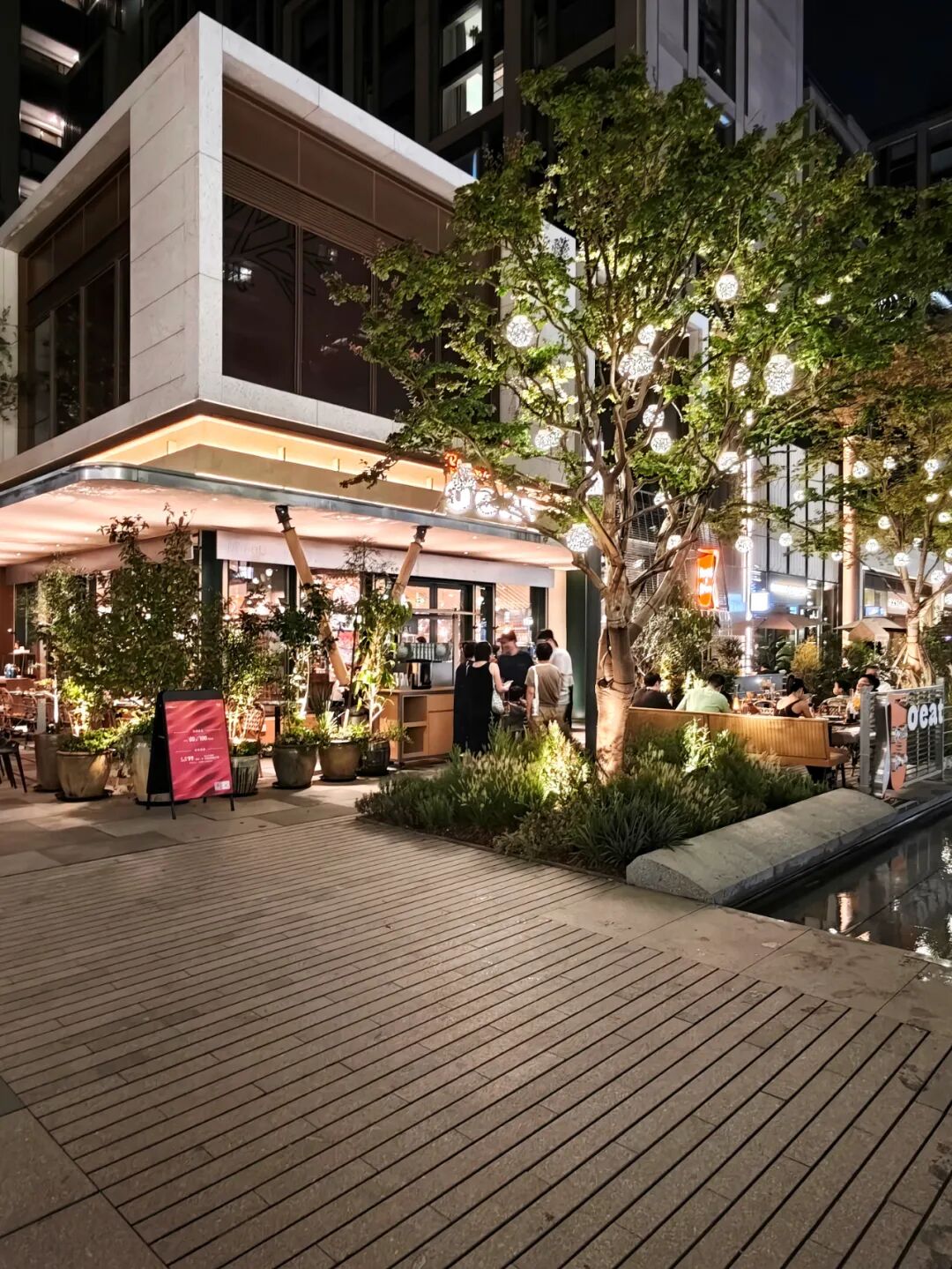 我們也有幸拍到視角從江邊越過大片農(nóng)田對望亞奧萬象天地的照片,且恰好在夜間遇見項目開業(yè)當(dāng)日的客流峰值。畢竟,人們都愿在舒適的夜間,迎著從江邊吹來的徐徐微風(fēng),來逛新商場特別是有chill氛圍的戶外街區(qū)。