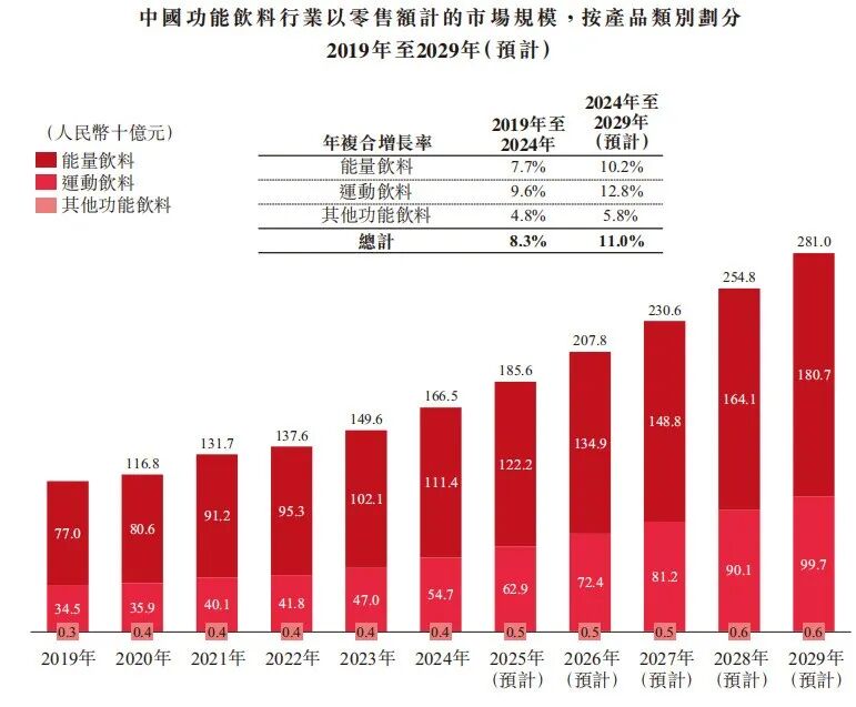 目前,中國軟飲行業(yè)仍是一個規(guī)模達(dá)萬億的巨大市場。根據(jù)弗若斯特沙利文報告,2024年中國軟飲行業(yè)零售額約達(dá)1.3萬億元,是全球第二大軟飲消費(fèi)市場。在這個龐大市場中,功能飲料已成為增長最快的板塊。2019年-2024年,功能飲料市場規(guī)模的年復(fù)合增長率達(dá)8.3%,高于同期整體軟飲市場的4.7%。