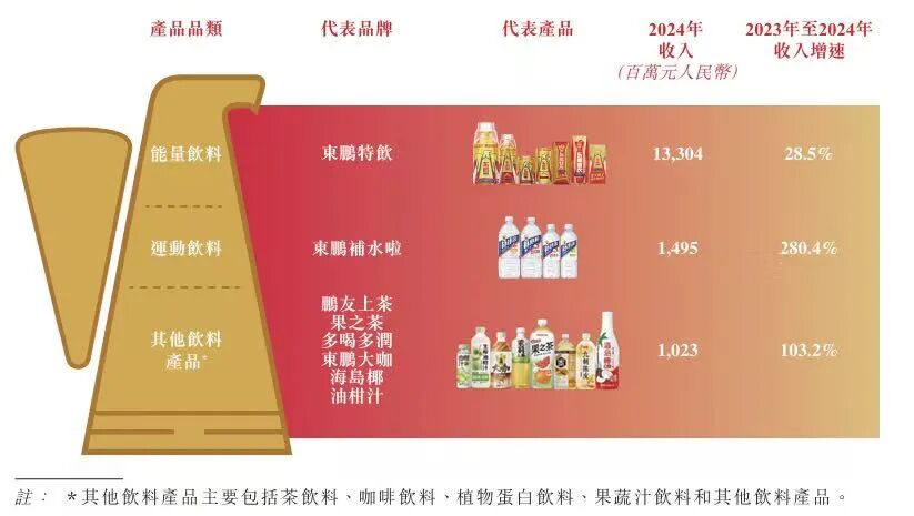 目前,能量飲料仍是東鵬飲料的主要收入來源,但占比已從2023年的91.9%下降至2024年的84.0%。與此同時,東鵬飲料的運(yùn)動飲料業(yè)務(wù)迅速崛起,2023年-2024年收入增速高達(dá)280.4%,占2024年總收入的9.4%。其他飲料產(chǎn)品同樣表現(xiàn)不俗,2023年-2024年收入增速達(dá)103.2%。