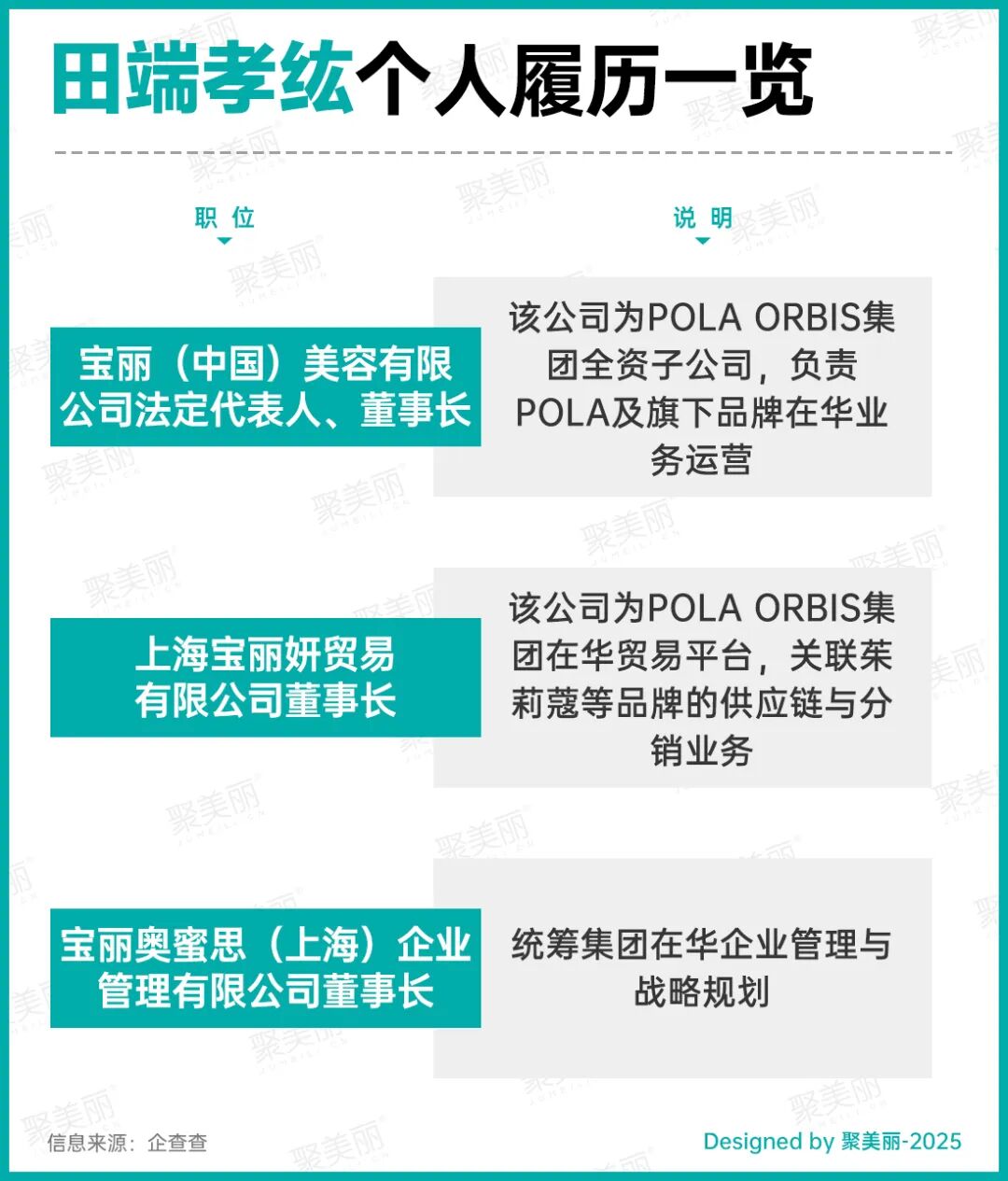 據(jù)企查查顯示,田端孝纮目前擔(dān)任三家公司的董事長(zhǎng),分別為寶麗(中國)美容有限公司(以下簡(jiǎn)稱:寶麗中國)、上海寶麗妍貿(mào)易有限公司(以下簡(jiǎn)稱:上海寶麗妍)、寶麗奧蜜思(上海)企業(yè)管理有限公司。其中寶麗中國為POLA ORBIS集團(tuán)全資子公司,負(fù)責(zé)POLA及旗下品牌在華業(yè)務(wù)運(yùn)營;上海寶麗妍則為POLA ORBIS集團(tuán)在華貿(mào)易平臺(tái),關(guān)聯(lián)茱莉蔻等品牌的供應(yīng)鏈與分銷業(yè)務(wù)。