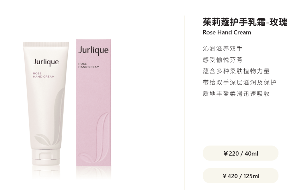 據(jù)茱莉蔻官網(wǎng)顯示,其產(chǎn)品線涵蓋護(hù)手霜、身體乳、精華水等,品牌定位圍繞“高端活機(jī)天然護(hù)膚”為核心,屬于國際中高端護(hù)膚品牌,價(jià)格區(qū)間顯著高于大眾護(hù)膚品牌。護(hù)手霜單價(jià)約200-400元,精華類產(chǎn)品多在500-1000元區(qū)間。