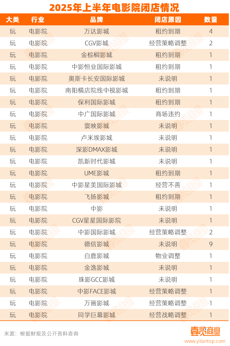 據(jù)壹覽商業(yè)不完全統(tǒng)計,2025年上半年,全國至少有38家電影院關(guān)閉。3月1日,UME影城(北京華星店)宣布閉店,這家影業(yè)已經(jīng)經(jīng)營22年,是北京第一家引入IMAX的影院;CGV長沙麓山店、上海盧米埃大融城影城、佛山兆陽保利國際影城等,也都選擇了關(guān)門。