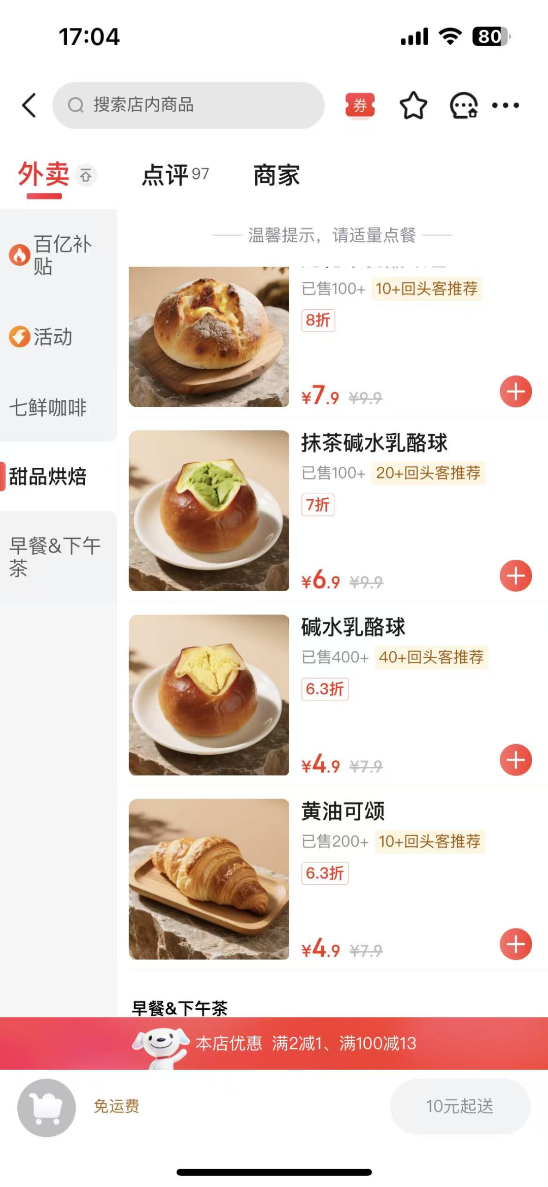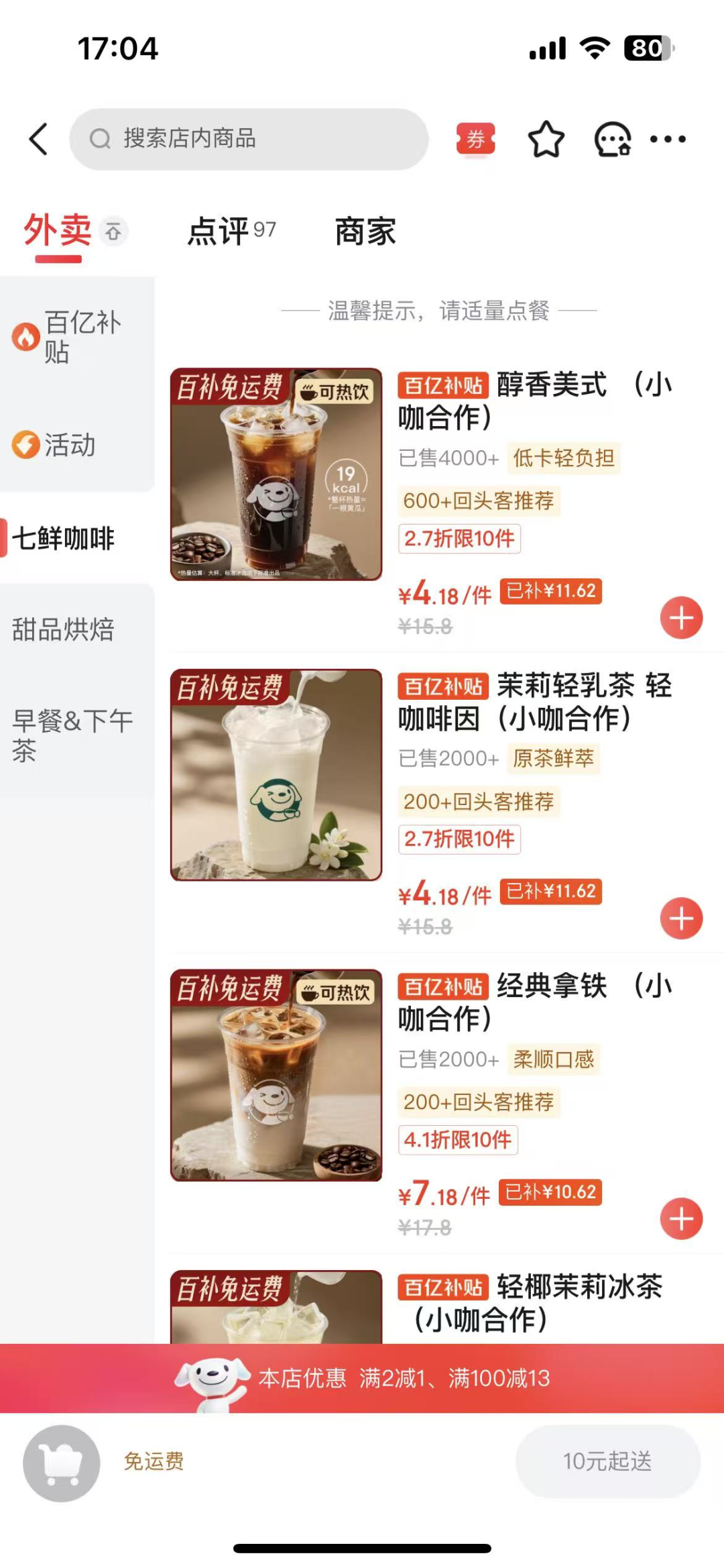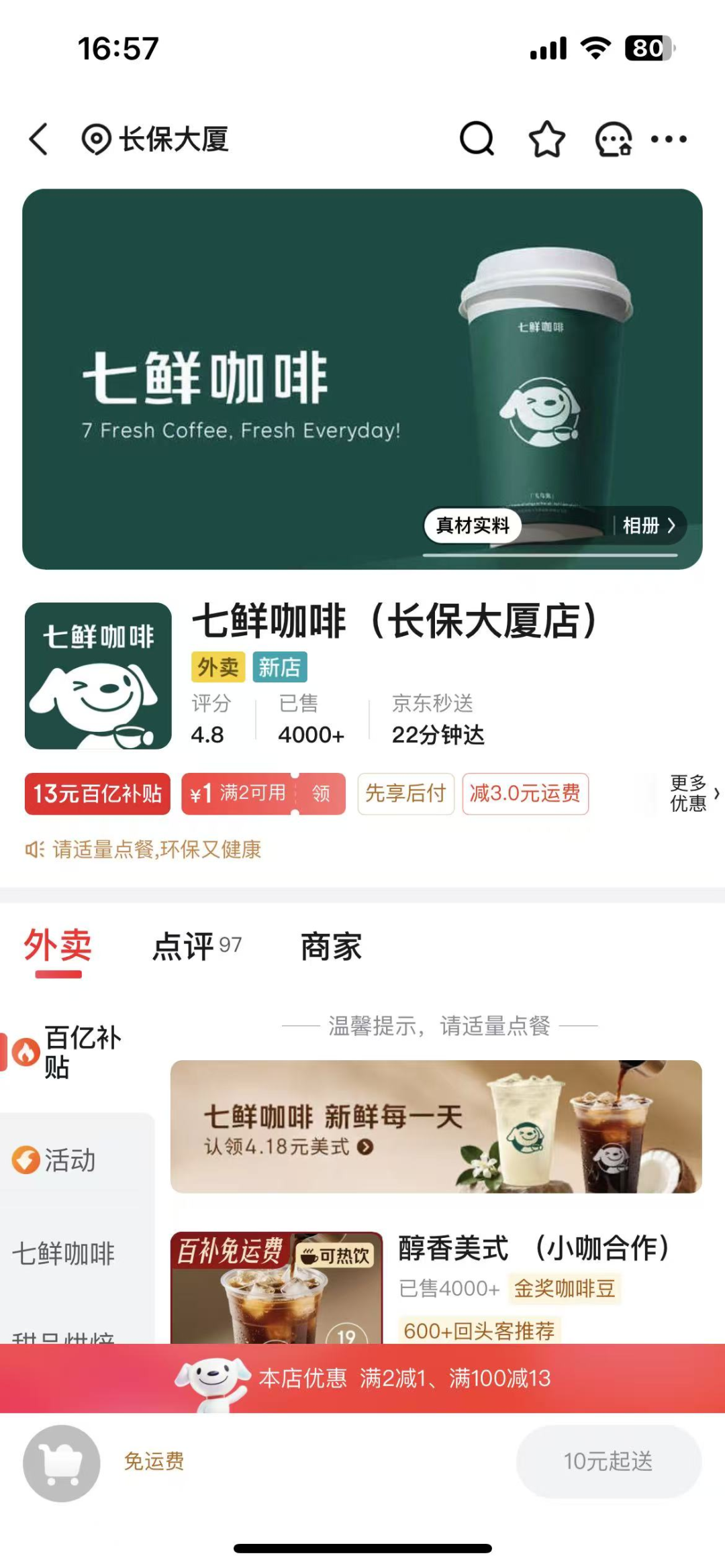 從產(chǎn)品看,七鮮咖啡的產(chǎn)品體系主要分:咖啡、甜品烘焙及早餐下午茶套餐,其中咖啡品類涵蓋美式、拿鐵等品類,分別有醇香美式、茉莉輕乳茶、輕椰茉莉冰茶、鮮奶拿鐵、茉莉花香拿鐵、生椰拿鐵、椰青美式、雙杯美式;甜品則有黃油提子司康、法式扁桃仁焦糖酥等熱門烘焙面包產(chǎn)品?Х鹊亩▋r僅為9.9元。但是在促銷期間價格更低,只有5元到7元。比瑞幸和庫迪更便宜。