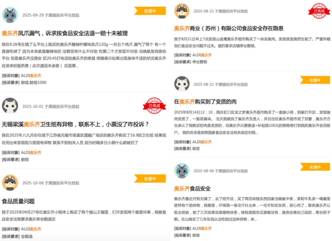 據(jù)公開投訴信息顯示,2025年7月以來,有消費者反映購買的食品中出現(xiàn)異物、水果腐爛等問題,部分消費者稱維權(quán)時曾遭遇門店工作人員對《食品安全法》相關條款的質(zhì)疑;據(jù)黑貓投訴平臺公開信息顯示,截至2025年10月10日,奧樂齊相關投訴已達221條,其中超40%發(fā)生在2025年,蘇州、無錫的新店也卷入爭議。