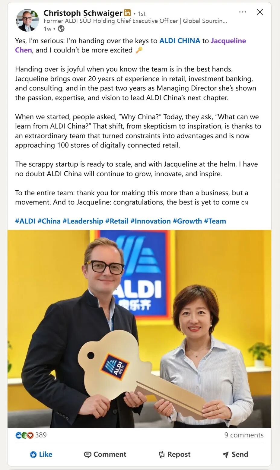 百年零售巨頭的中國故事,從來不是簡單的模式復制。如今陳佳掌舵,她所面臨的,不僅是如何讓奧樂齊跑快點,更是如何讓這家德國企業(yè)真正融入中國市場的消費脈絡,而這,亦成為行業(yè)當下最關注的話題之一。