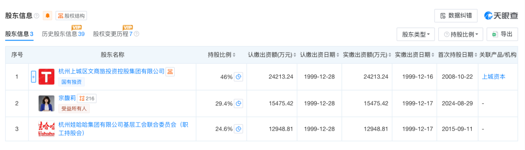 不過,娃哈哈集團(tuán)的董事會成員未發(fā)生變更,宗馥莉仍為董事會主席及總經(jīng)理。同時,宗馥莉仍為杭州娃哈哈集團(tuán)法定代表人,娃哈哈集團(tuán)由上城文旅、宗馥莉、杭州娃哈哈集團(tuán)有限公司基層工會聯(lián)合委員會(職工持股會)共同持股,其中上城文旅、宗馥莉分別持股46%、29.4%,宗馥莉為第二大股東。