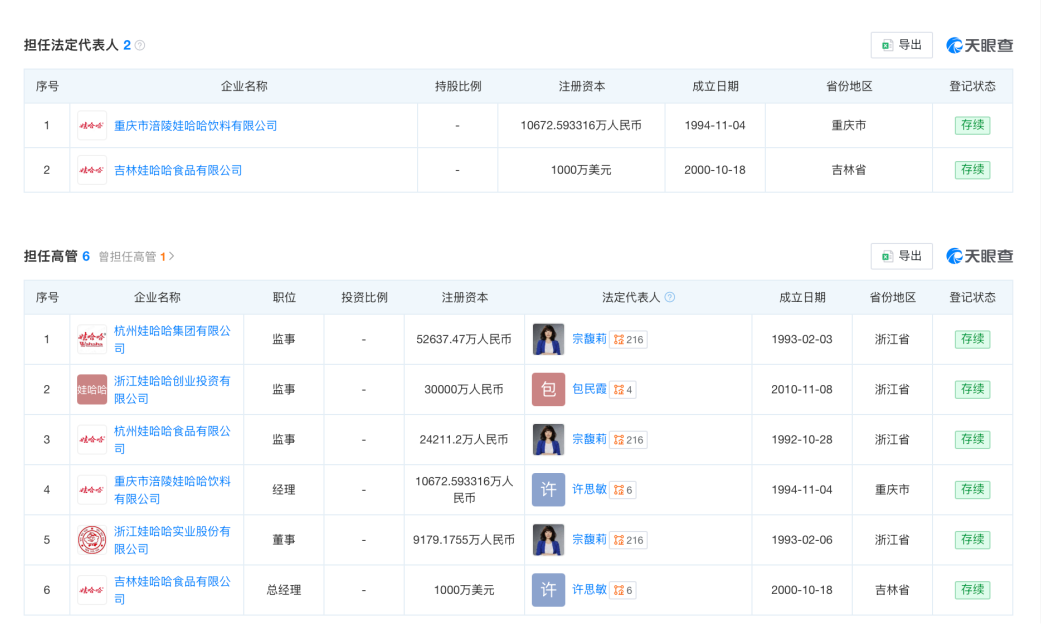 企天眼查顯示,許思敏目前擔(dān)任杭州娃哈哈集團(tuán)、浙江娃哈哈創(chuàng)業(yè)投資有限公司、杭州娃哈哈食品有限公司等企業(yè)的監(jiān)事;重慶市涪陵娃哈哈飲料有限公司經(jīng)理;浙江娃哈哈實業(yè)股份有限公司董事;吉林娃哈哈食品有限公司法定總經(jīng)理等。