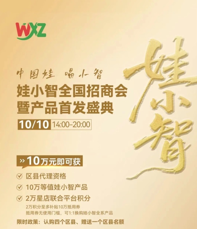 招商海報顯示,10月10日“娃小智”在杭州舉行了全國招商會,購買“娃小智”產(chǎn)品10萬元以上即可獲得該區(qū)域獨家經(jīng)銷商資格。