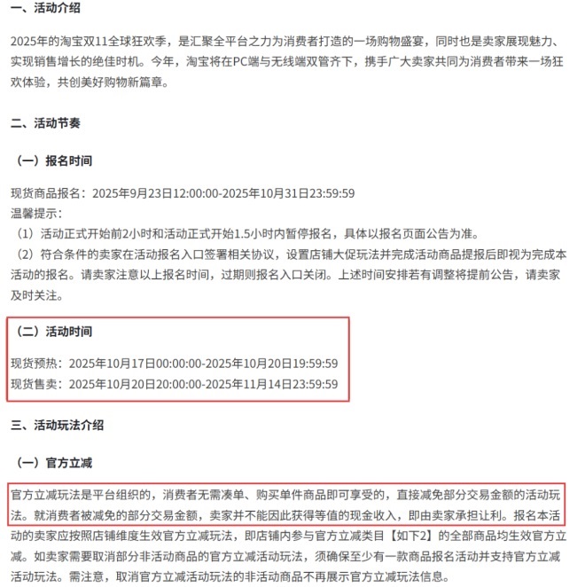 淘寶、天貓的調(diào)整力度更為突出,取消了以往多輪預(yù)售與現(xiàn)貨的復(fù)雜模式,將核心玩法聚焦為“官方立減”,即消費(fèi)者無(wú)需湊單,購(gòu)買單件商品即可享受直接減免部分交易金額。