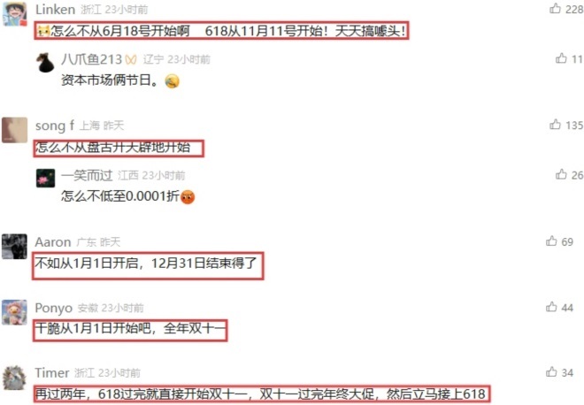 “怎么不從6月18日開(kāi)始,618從11月11日開(kāi)始!天天搞噱頭!”“怎么不從盤古開(kāi)天辟地開(kāi)始!
