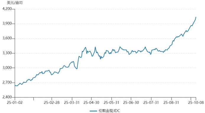 10月8日,現(xiàn)貨黃金(倫敦金現(xiàn))價(jià)格首次沖破4000美元/盎司關(guān)口,創(chuàng)歷史新高。2025年至今,現(xiàn)貨黃金的漲幅已超過(guò)53%。