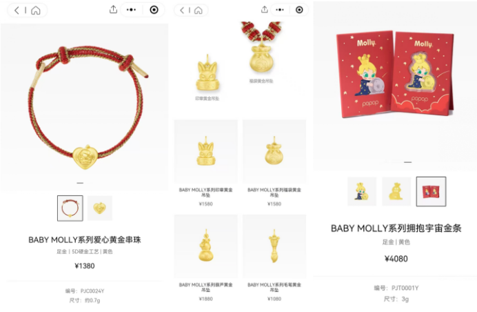 而在popop推出足金產(chǎn)品之前,泡泡瑪特就曾與周生生有過(guò)合作。實(shí)際上,在黃金珠寶行業(yè),“IP+黃金”的產(chǎn)品形式已不新鮮。